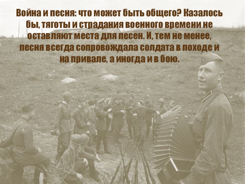 Слайд 3Война и песня: что может быть общего? Казалось бы, тяготы и