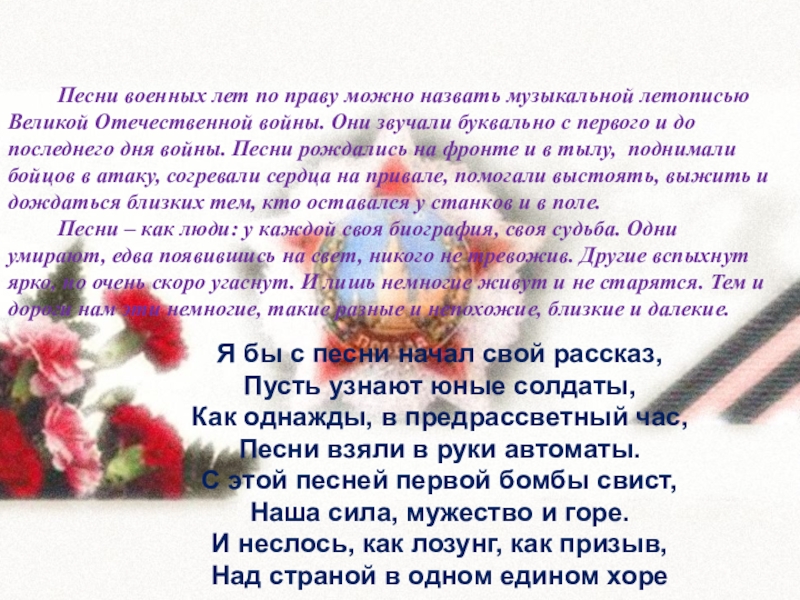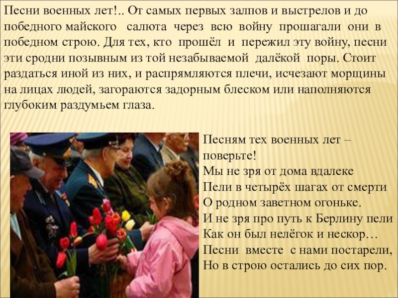 победного майского салюта через всю войну прошагали они в победном строю. Для тех, кто прошёл и пережил эту войну, песни эти сродни позывным из той незабываемой далёкой поры. Стоит раздаться иной из них, и распрямляются плечи, исчезают морщины на лицах людей, загораются задорным блеском или наполняются глубоким раздумьем глаза.
