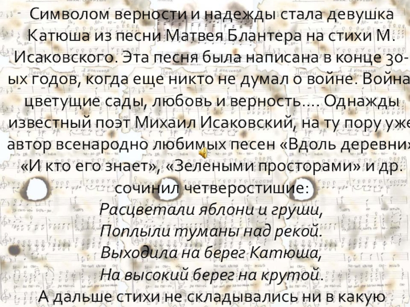 Слайд 11Символом верности и надежды стала девушка Катюша из песни Матвея Блантера