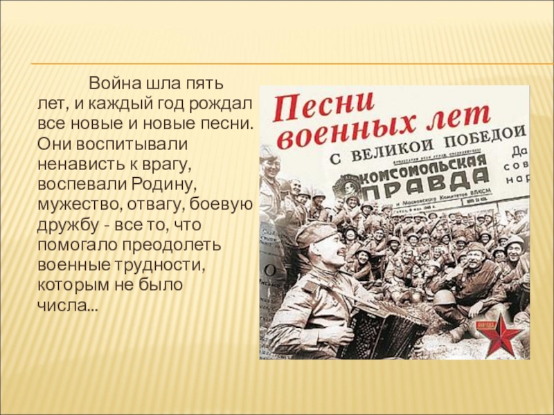 и новые песни. Они воспитывали ненависть к врагу, воспевали Родину, мужество, отвагу, боевую дружбу - все то, что помогало преодолеть военные трудности, которым не было числа...