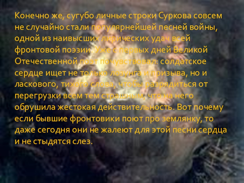 Слайд 9Конечно же, сугубо личные строки Суркова совсем не случайно стали популярнейшей