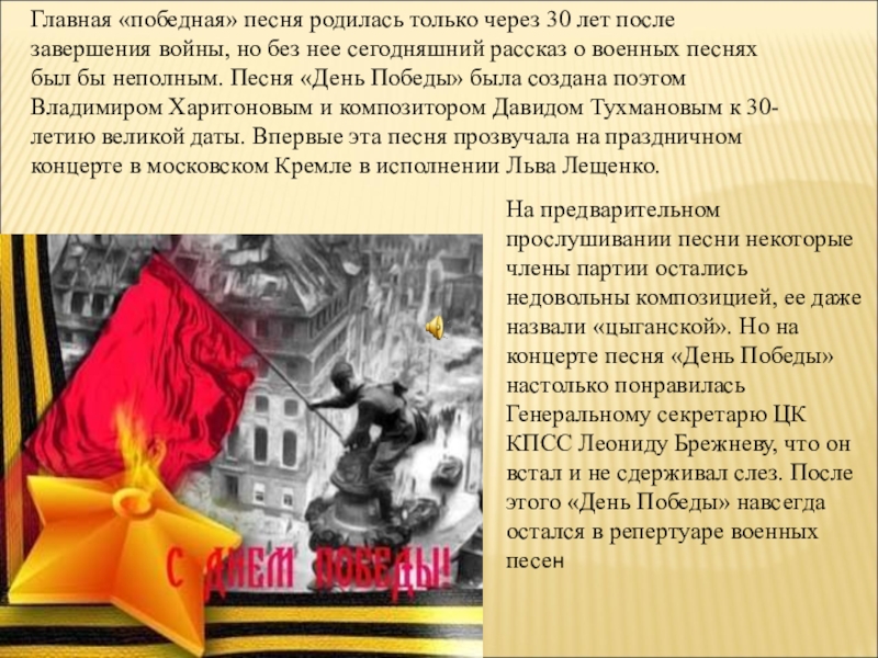 но без нее сегодняшний рассказ о военных песнях был бы неполным. Песня «День Победы» была создана поэтом Владимиром Харитоновым и композитором Давидом Тухмановым к 30-летию великой даты. Впервые эта песня прозвучала на праздничном концерте в московском Кремле в исполнении Льва Лещенко.