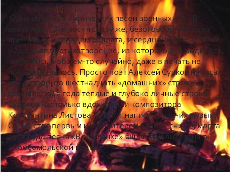 песня сразу же, безоговорочно была принята — и сердцем солдата, и сердцами тех, кто его ждал. А ведь стихотворение, из которого она родилась, появилось в общем-то случайно, даже в печать не предназначалось. Просто поэт Алексей Сурков написал жене с фронта шестнадцать «домашних» строк.В феврале 1942 года теплые и глубоко личные строки Суркова настолько вдохновили композитора Константина Листова, что тот написал для них музыку. Он же стал первым исполнителем этой песни. 25 марта 1942 года песня «В землянке» была опубликована в «Комсомольской правде.