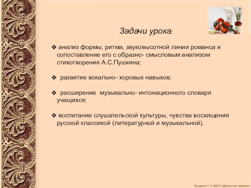 Задачи урока: анализ формы, ритма, звуковысотной линии романса и сопоставление его с образно- смысловым анализом стихотворения А.С.Пушкина;