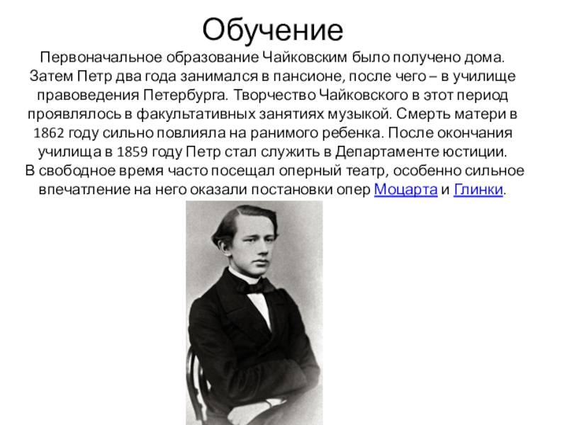 в пансионе, после чего – в училище правоведения Петербурга. Творчество Чайковского в этот период проявлялось в факультативных занятиях музыкой. Смерть матери в 1862 году сильно повлияла на ранимого ребенка. После окончания училища в 1859 году Петр стал служить в Департаменте юстиции. В свободное время часто посещал оперный театр, особенно сильное впечатление на него оказали постановки опер Моцарта и Глинки.