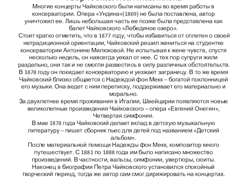 в консерватории. Опера «Ундина»(1869) не была поставлена, автор уничтожил ее. Лишь небольшая часть ее позже была представлена как балет Чайковского «Лебединое озеро». Стоит кратко отметить, что в 1877 году, чтобы избавиться от сплетен о своей нетрадиционной ориентации, Чайковский решил жениться на студентке консерватории Антонине Милюковой. Не испытывая к жене чувств, спустя несколько недель, он навсегда уехал от нее. С тех пор супруги жили раздельно, они так и не смогли развестись в силу различных обстоятельств. В 1878 году он покидает консерваторию и уезжает заграницу. В то же время Чайковский близко общается с Надеждой фон Мекк – богатой поклонницей его музыки. Она ведет с ним переписку, поддерживает его материально и морально. За двухлетнее время проживания в Италии, Швейцарии появляются новые великолепные произведения Чайковского – опера «Евгений Онегин», Четвертая симфония. В мае 1878 года Чайковский делает вклад в детскую музыкальную литературу – пишет сборник пьес для детей под названием «Детский альбом». После материальной помощи Надежды фон Мекк, композитор много путешествует. С 1881 по 1888 года им было написано множество произведений. В частности, вальсы, симфонии, увертюры, сюиты. Наконец в биографии Петра Чайковского установился спокойный творческий период, тогда же автор сам смог дирижировать на концертах.