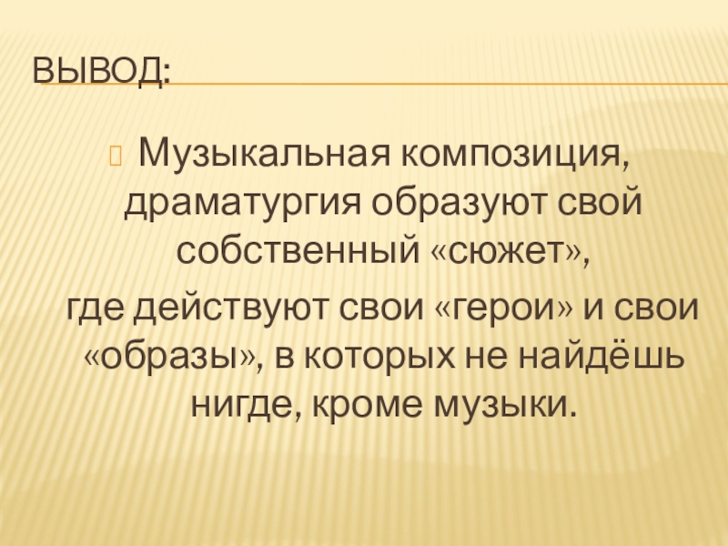 Вывод:Музыкальная композиция, драматургия образуют свой собственный «сюжет»,  где действуют свои «герои» и свои «образы», в которых