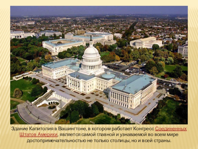 Слайд 3Здание Капитолия в Вашингтоне, в котором работает Конгресс Соединенных Штатов Америки, является