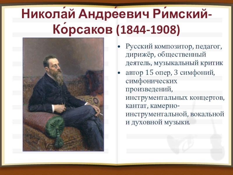 Никола́й Андре́евич Ри́мский-Ко́рсаков (1844-1908) Русский композитор, педагог, дирижёр, общественный деятель, музыкальный критикавтор 15 опер, 3 симфоний, симфонических