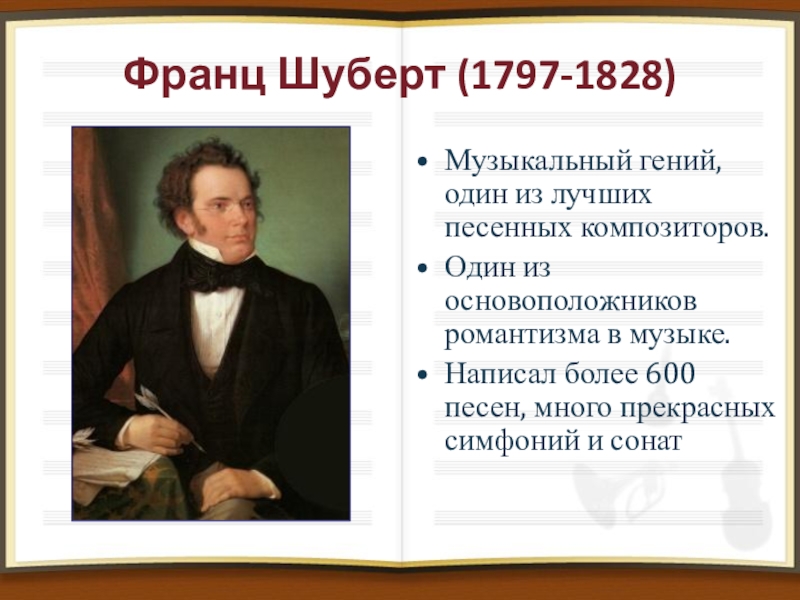 Франц Шуберт (1797-1828)Музыкальный гений, один из лучших песенных композиторов.Один из основоположников романтизма в музыке.Написал более 600 песен,