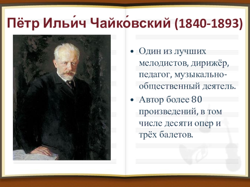 Пётр Ильи́ч Чайко́вский (1840-1893) Один из лучших мелодистов, дирижёр, педагог, музыкально-общественный деятель. Автор более 80 произведений, в