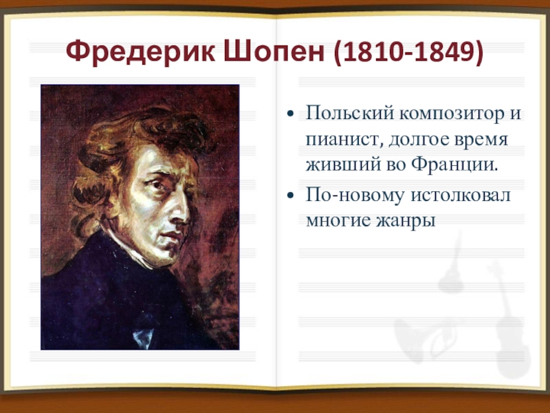 Фредерик Шопен (1810-1849) Польский композитор и пианист, долгое время живший во Франции. По-новому истолковал многие жанры