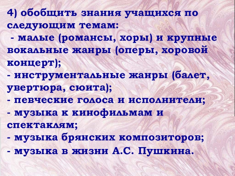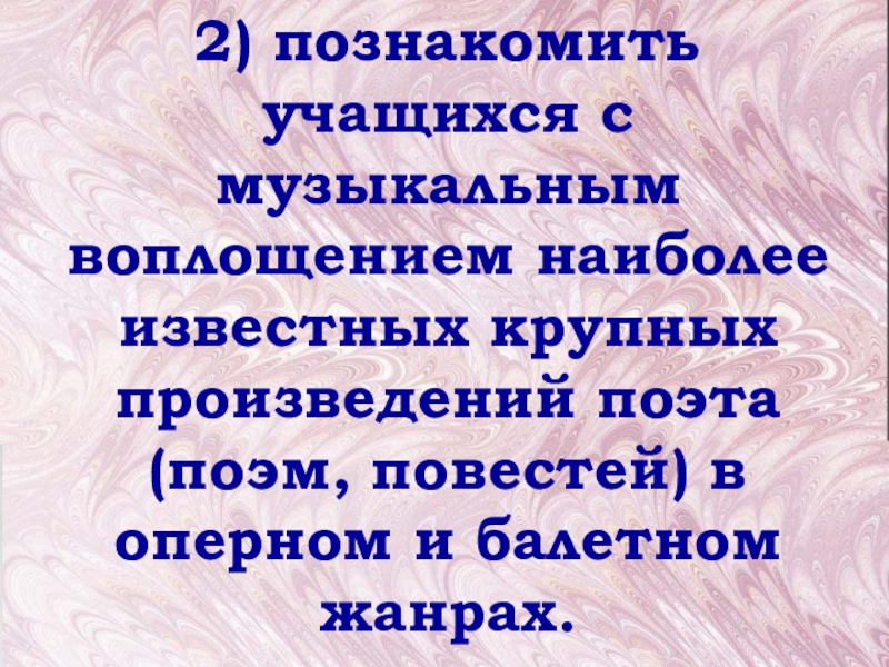 2) познакомить учащихся с музыкальным воплощением наиболее известных крупных произведений поэта (поэм, повестей) в оперном и балетном жанрах.