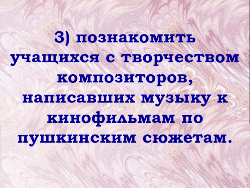 3) познакомить учащихся с творчеством композиторов, написавших музыку к кинофильмам по пушкинским сюжетам.