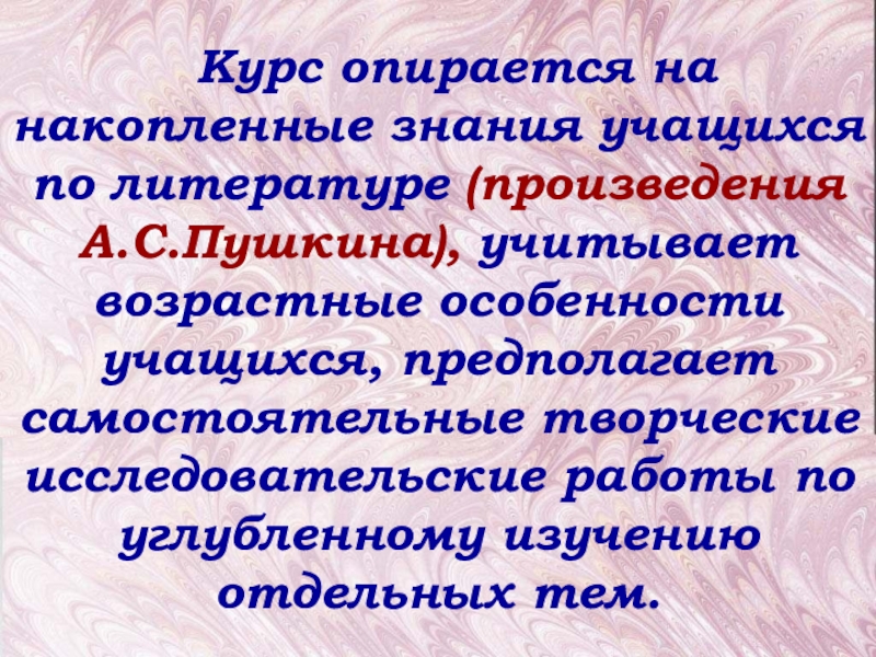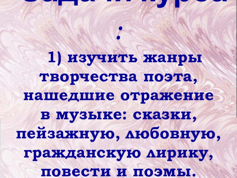 Цель курса: систематизировать знания учащихся о творчестве поэта, привить любовь к русской музыке и поэзии.