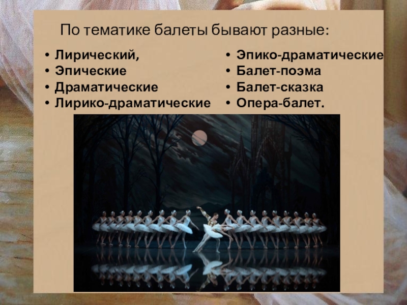 По тематике балеты бывают разные: Лирический,ЭпическиеДраматическиеЛирико-драматическиеЭпико-драматическиеБалет-поэмаБалет-сказкаОпера-балет.