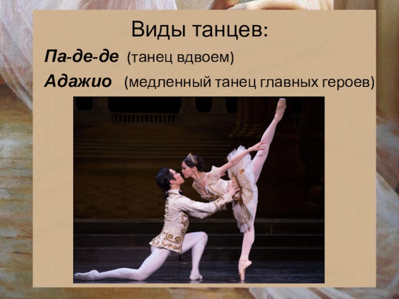 Виды танцев: Па-де-де (танец вдвоем)Адажио  (медленный танец главных героев)