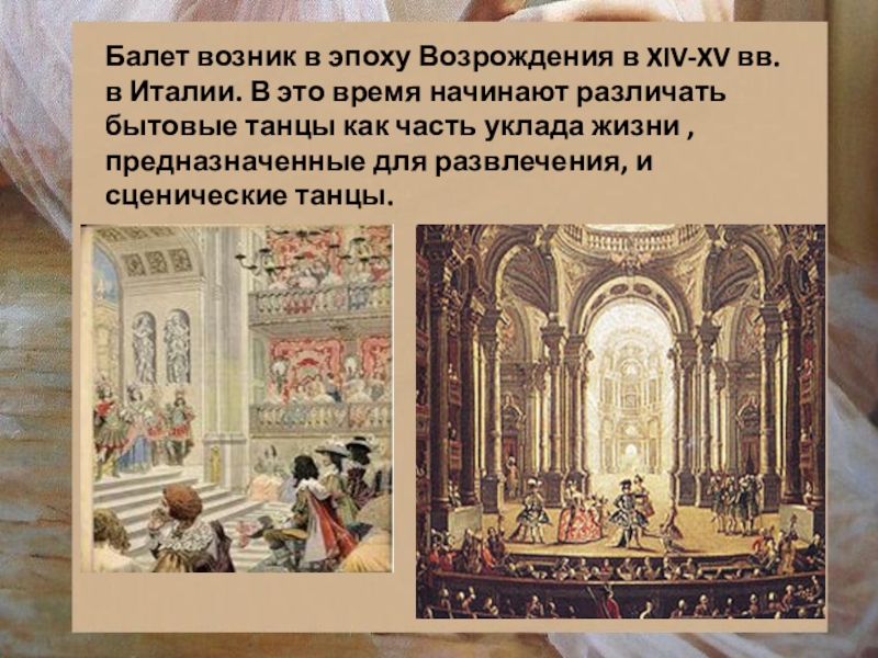 Балет возник в эпоху Возрождения в XIV-XV вв. в Италии. В это время начинают различать бытовые танцы
