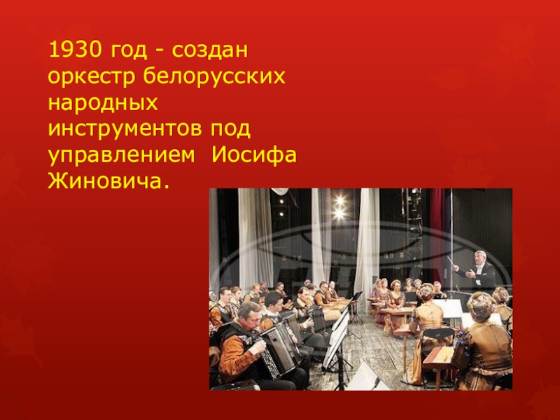 Слайд 31930 год - создан оркестр белорусских народных инструментов под управлением Иосифа