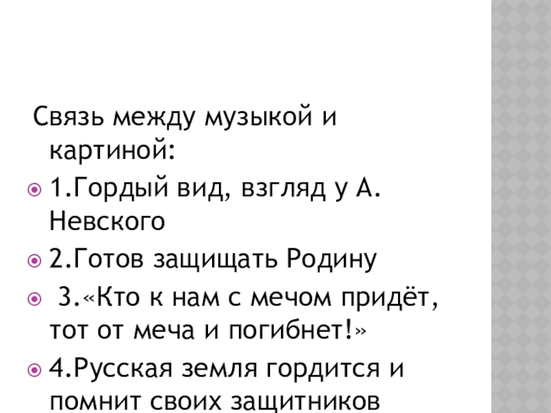 Связь между музыкой и картиной: 1.Гордый вид, взгляд у А.Невского 2.Готов защищать Родину 3.«Кто к нам с