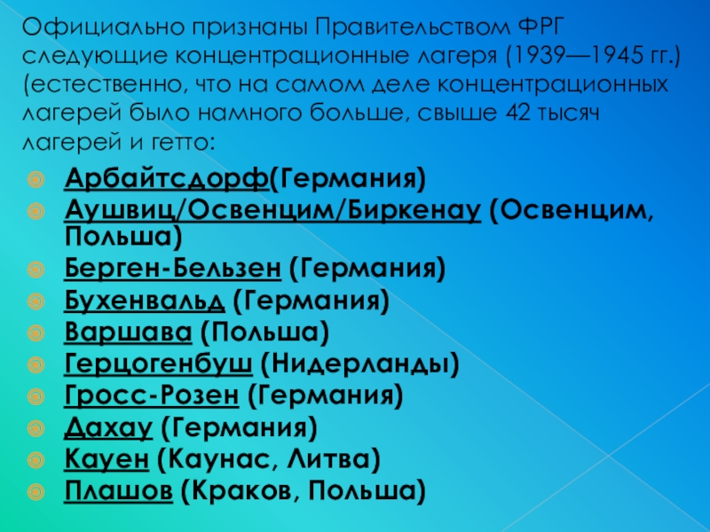 В Германии, и аккупированных ею территориях, было создано фашистами много концлагерей, в которых проводились страшные опыты на взрослых и детях, многие в этих лагерях погибли от голода, инфекционных болезней и холода. Фашисты даже не тратили на узников патроны. Людей живыми сжигали в крематориях.