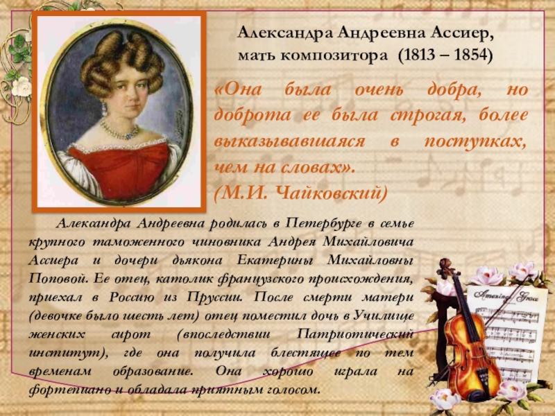 Петр Ильич Чайковский унаследовал от отца веру в лучшие человеческие устремления, способность сострадать и принимать участие в судьбе ближних.