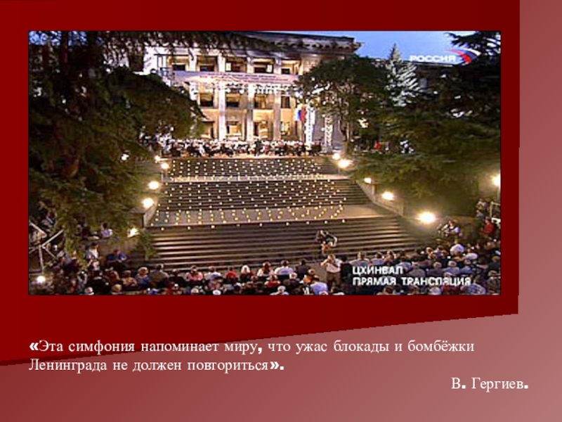 «Эта симфония напоминает миру, что ужас блокады и бомбёжки Ленинграда не должен повториться». В. Гергиев.