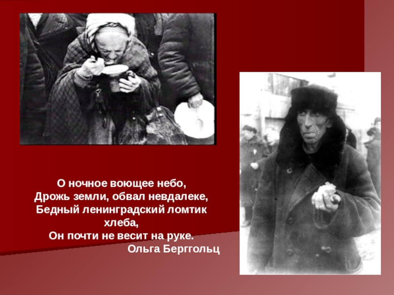 О ночное воющее небо,Дрожь земли, обвал невдалеке,Бедный ленинградский ломтик хлеба,Он почти не весит на руке.Ольга Берггольц