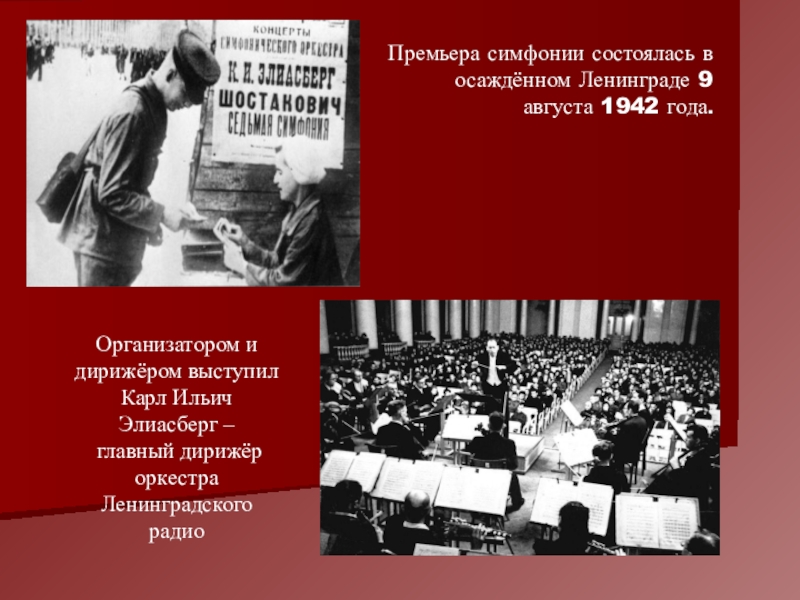 Слайд 9Премьера симфонии состоялась в осаждённом Ленинграде 9 августа 1942 года.
