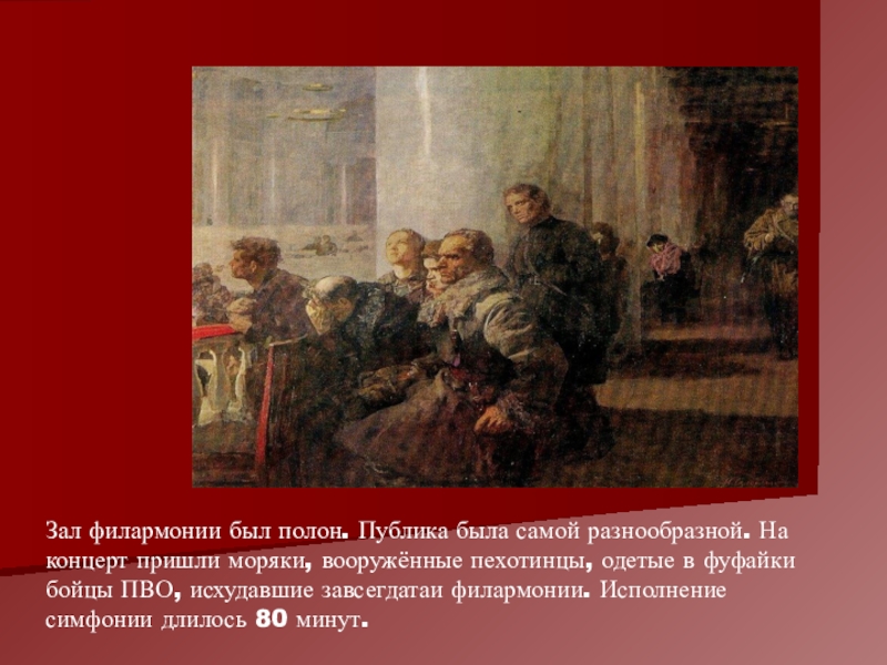 моряки, вооружённые пехотинцы, одетые в фуфайки бойцы ПВО, исхудавшие завсегдатаи филармонии. Исполнение симфонии длилось 80 минут.