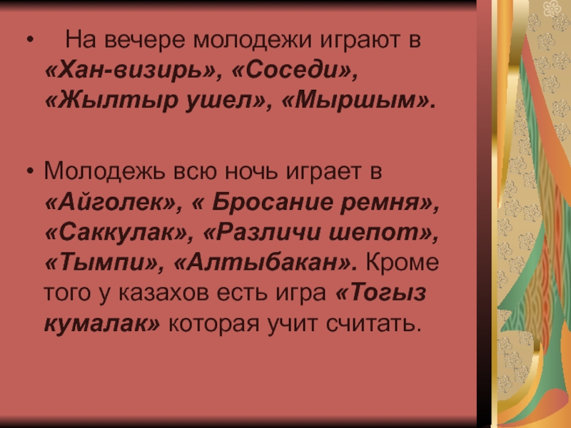 Слайд 16 На вечере молодежи играют в «Хан-визирь», «Соседи», «Жылтыр ушел»,