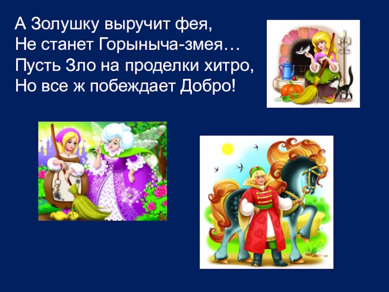 А Золушку выручит фея,Не станет Горыныча-змея…Пусть Зло на проделки хитро,Но все ж побеждает Добро!
