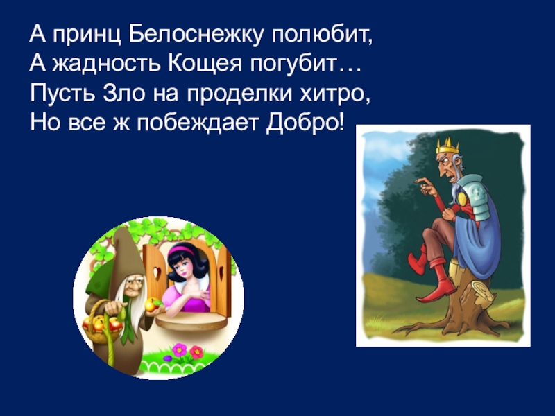 А принц Белоснежку полюбит,А жадность Кощея погубит…Пусть Зло на проделки хитро,Но все ж побеждает Добро!
