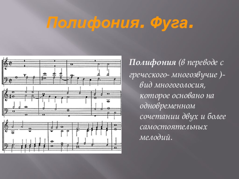и итальянского – бег, быстрое течение) – это многоголосное полифоническое произведение, которое строится на проведении одной или нескольких музыкальных тем во всех голосах.