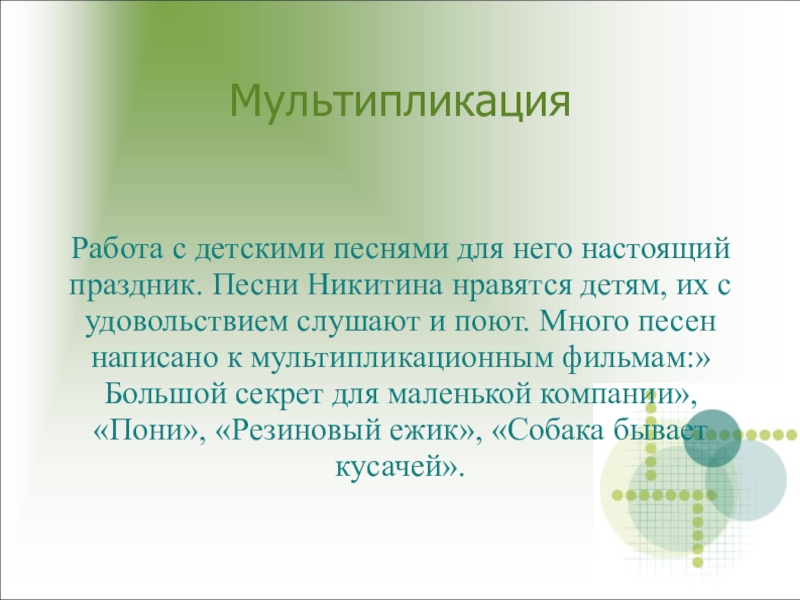 детям, их с удовольствием слушают и поют. Много песен написано к мультипликационным фильмам:»Большой секрет для маленькой компании», «Пони», «Резиновый ежик», «Собака бывает кусачей».