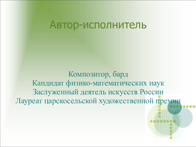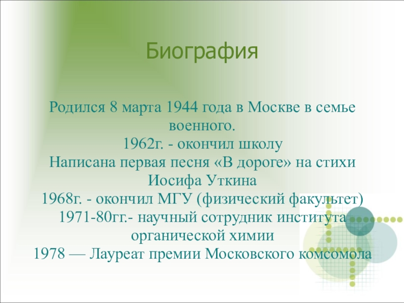На самых ранних магнитофонных записях его гитара уже звучит профессионально. Являясь музыкантом от рождения, он стал композитором-бардом.