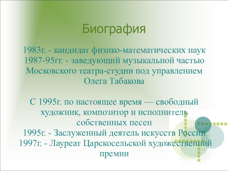 С 1995г. по настоящее время — свободный художник, композитор и исполнитель собственных песен