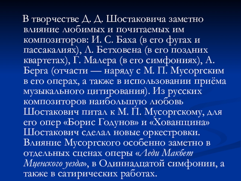 композиторов: И. С. Баха (в его фугах и пассакалиях), Л. Бетховена (в его поздних квартетах), Г. Малера (в его симфониях), А. Берга (отчасти — наряду с М. П. Мусоргским в его операх, а также в использовании приёма музыкального цитирования). Из русских композиторов наибольшую любовь Шостакович питал к М. П. Мусоргскому, для его опер «Борис Годунов» и «Хованщина» Шостакович сделал новые оркестровки. Влияние Мусоргского особенно заметно в отдельных сценах оперы «Леди Макбет Мценского уезда», в Одиннадцатой симфонии, а также в сатирических работах.