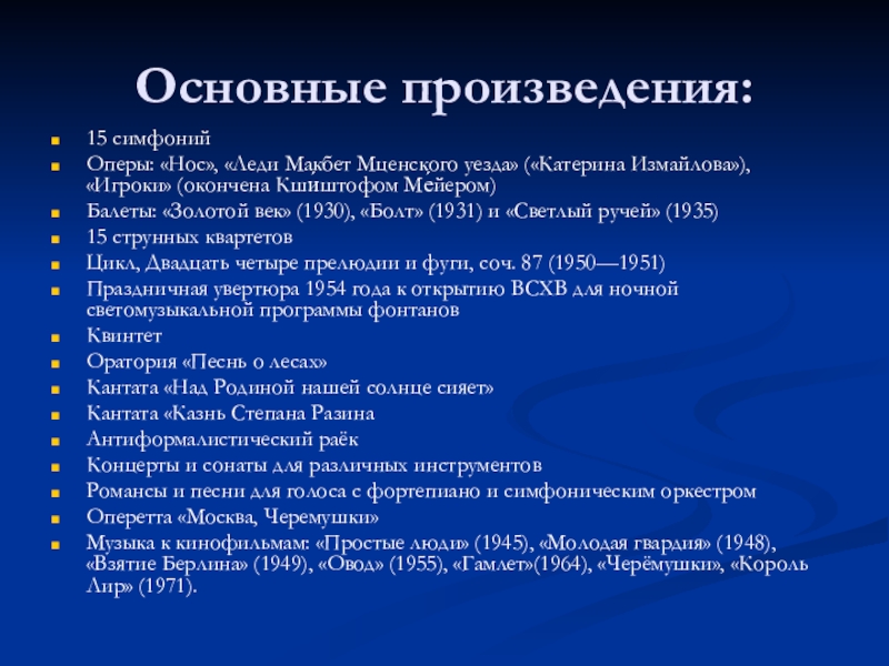 Оперы: «Нос», «Леди Макбет Мценского уезда» («Катерина Измайлова»),