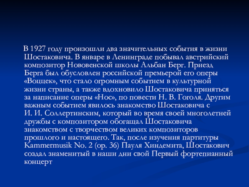 Шостаковича. В январе в Ленинграде побывал австрийский композитор Нововенской школы Альбан Берг. Приезд Берга был обусловлен российской премьерой его оперы «Воццек», что стало огромным событием в культурной жизни страны, а также вдохновило Шостаковича приняться за написание оперы «Нос», по повести Н. В. Гоголя. Другим важным событием явилось знакомство Шостаковича с И. И. Соллертинским, который во время своей многолетней дружбы с композитором обогащал Шостаковича знакомством с творчеством великих композиторов прошлого и настоящего. Так, после изучения партитуры Kammermusik No. 2 (op. 36) Пауля Хиндемита, Шостакович создал знаменитый в наши дни свой Первый фортепианный концерт