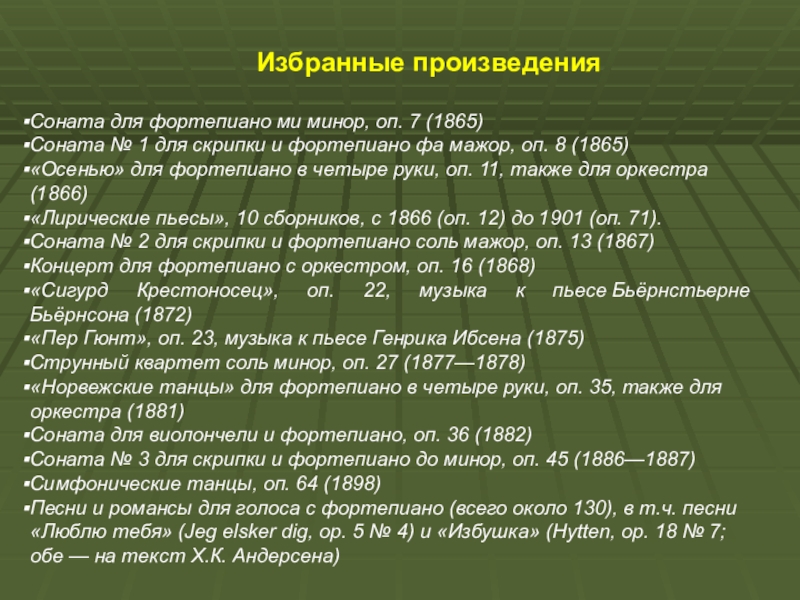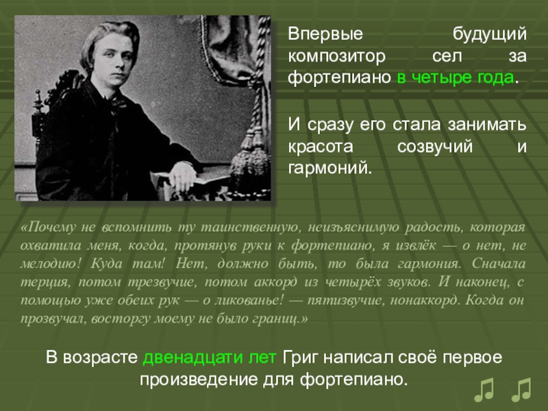 В возрасте двенадцати лет Григ написал своё первое произведение для фортепиано.