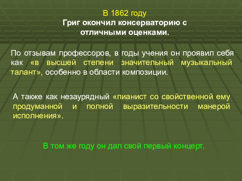 Григ окончил консерваторию с отличными оценками.