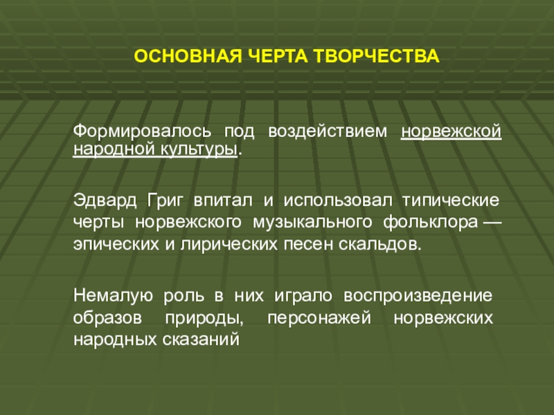 Немалую роль в них играло воспроизведение образов природы, персонажей норвежских народных сказаний