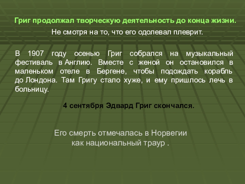 В 1907 году осенью Григ собрался на музыкальный фестиваль в Англию. Вместе с женой он остановился в маленьком отеле в Бергене, чтобы подождать корабль до Лондона. Там Григу стало хуже, и ему пришлось лечь в больницу.