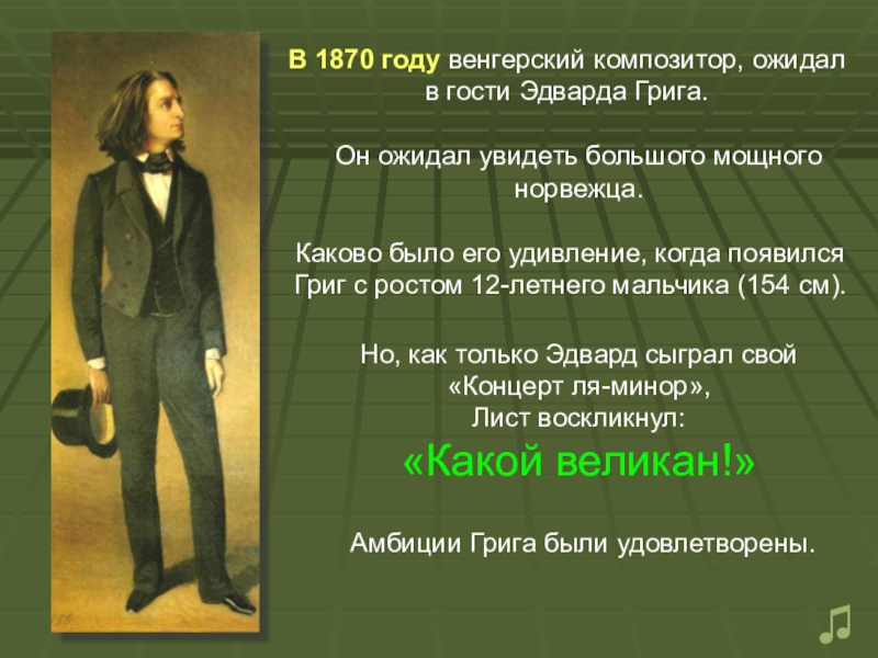Каково было его удивление, когда появился Григ с ростом 12-летнего мальчика (154 см).