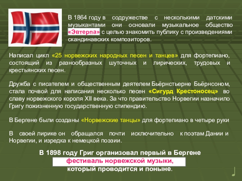 Дружба с писателем и общественным деятелем Бьёрнстьерне Бьёрнсоном, стала почвой для написания несколько песен «Сигурд Крестоносец» во славу норвежского короля XII века. За что правительство Норвегии назначило Григу пожизненную государственную стипендию.