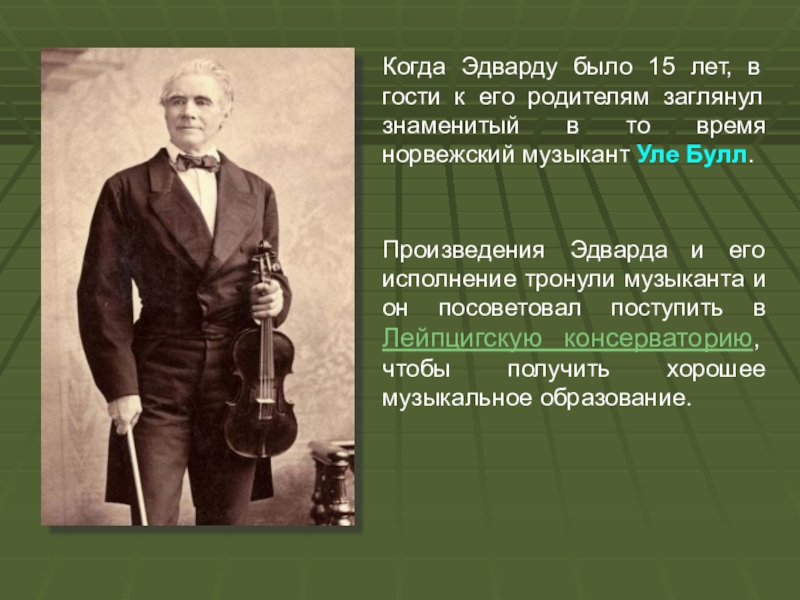 Произведения Эдварда и его исполнение тронули музыканта и он посоветовал поступить в Лейпцигскую консерваторию, чтобы получить хорошее музыкальное образование.