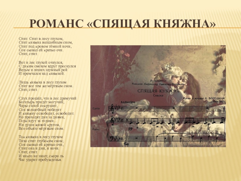 романс «Спящая княжна»     Спит. Спит в лесу глухом, Спит княжна волшебным сном, Спит