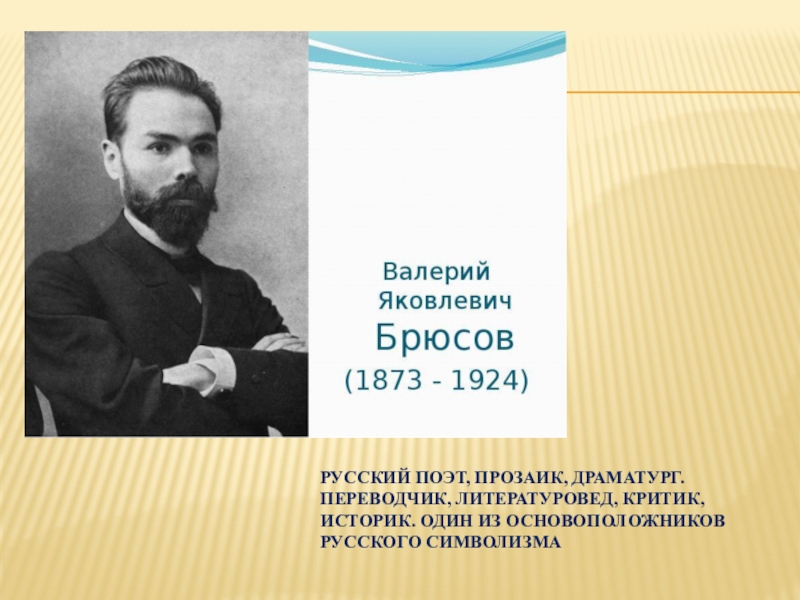 Русский поэт, прозаик, драматург. Переводчик, литературовед, критик, историк. Один из основоположников русского символизма