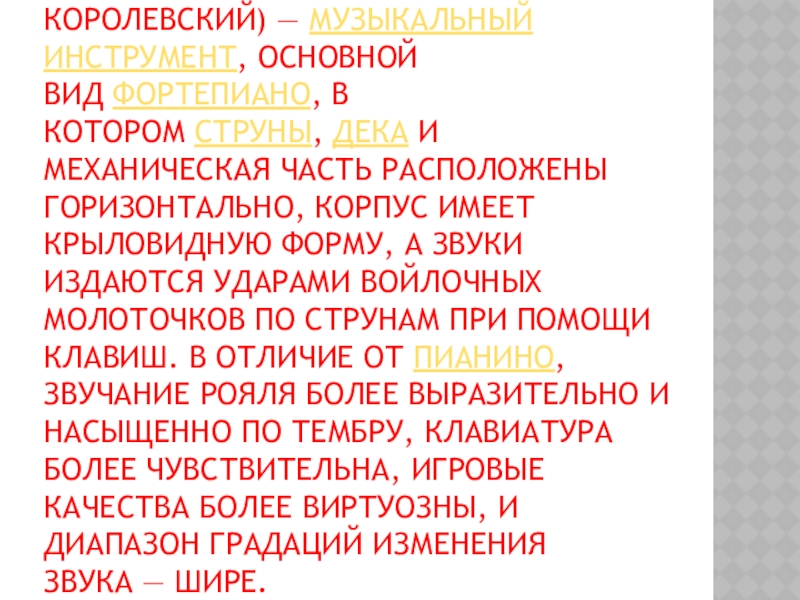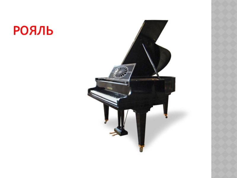 Слайд 9Роя́ль (фр. royal — королевский) — музыкальный инструмент, основной вид фортепиано, в котором струны, дека и механическая часть расположены горизонтально,